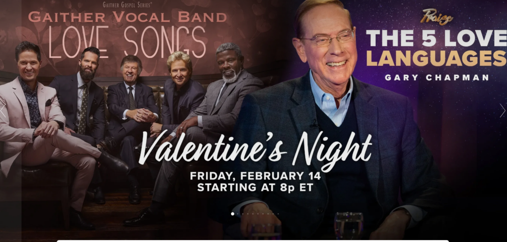 | Gaither Love Songs – 5pm PT/8pm ET Matt & Laurie Crouch host Gary Chapman: 5 Love Languages –6pm PT/9pm ET Gaither Love Songs – 7pm PT/10pm ET Matt & Laurie Crouch host Gary Chapman: 5 Love Languages – 8pm PT/11pm ET |